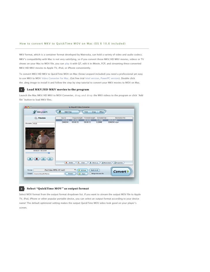 To play MKV on Mac, you can select any of the above formats as the output file. If you wanna convert MKV to MP4, select 'MP4' as output file format. To play MKV on Mac with QuickTime, import MKV to iMovie, convert MKV to AVI, M4V, MOV, 3GP, other supported formats.